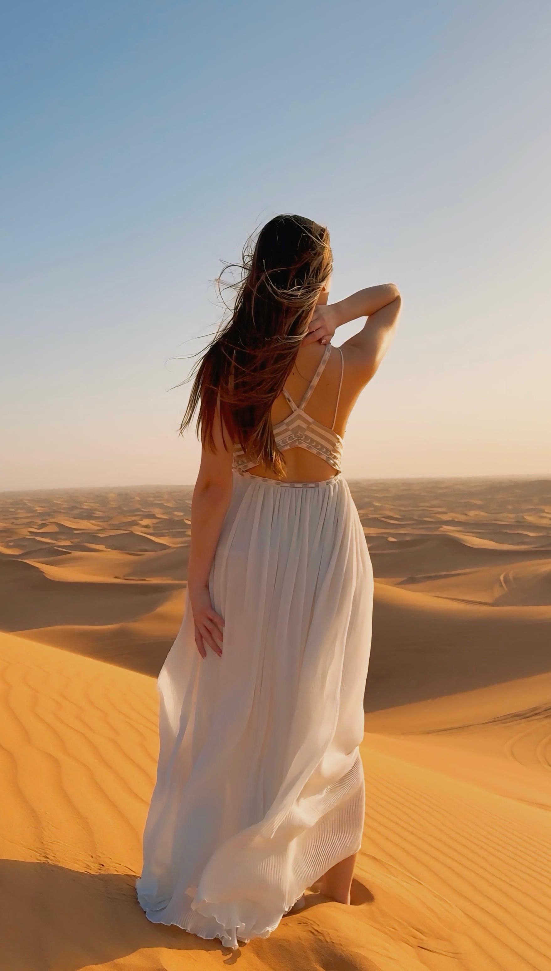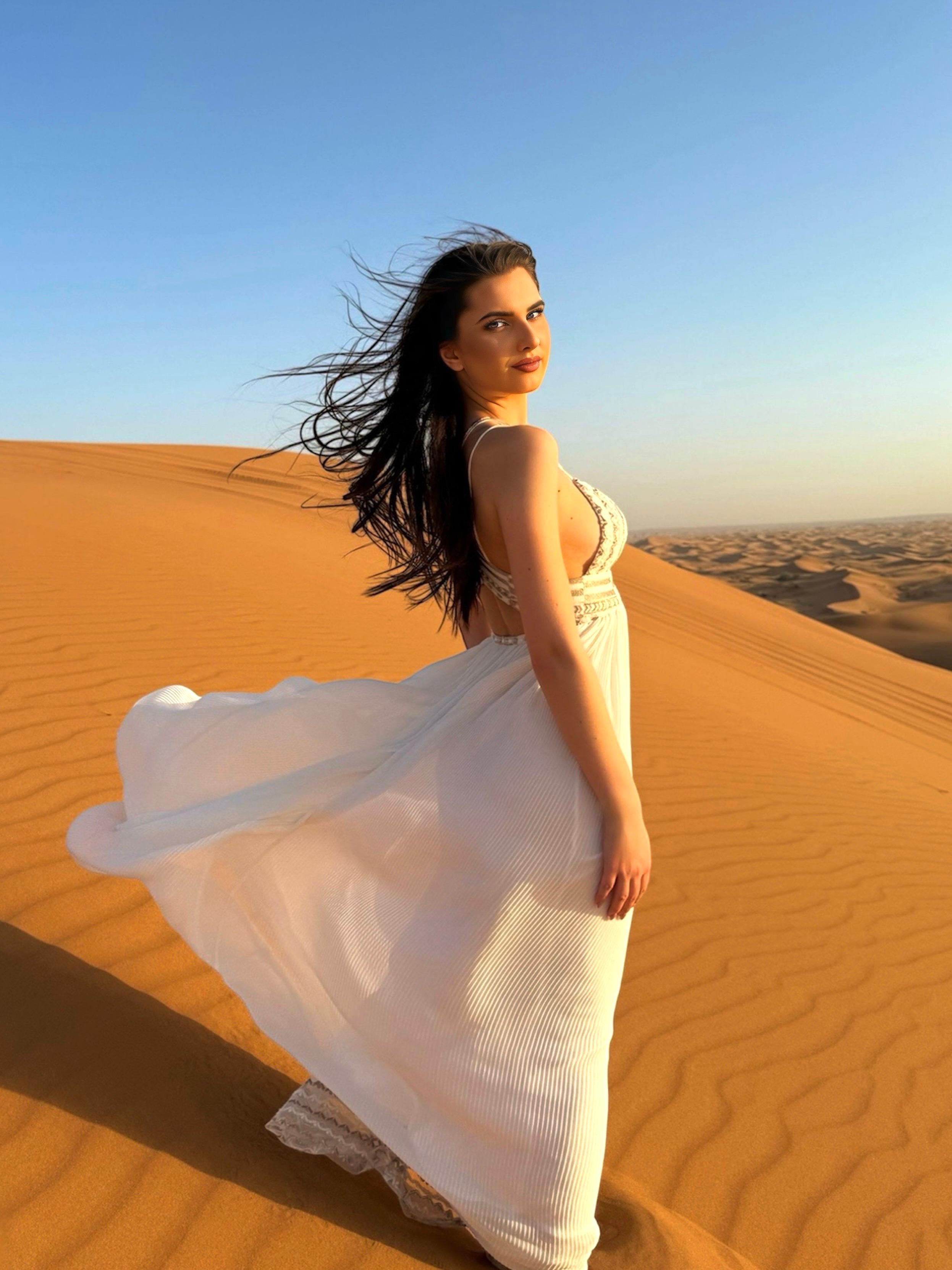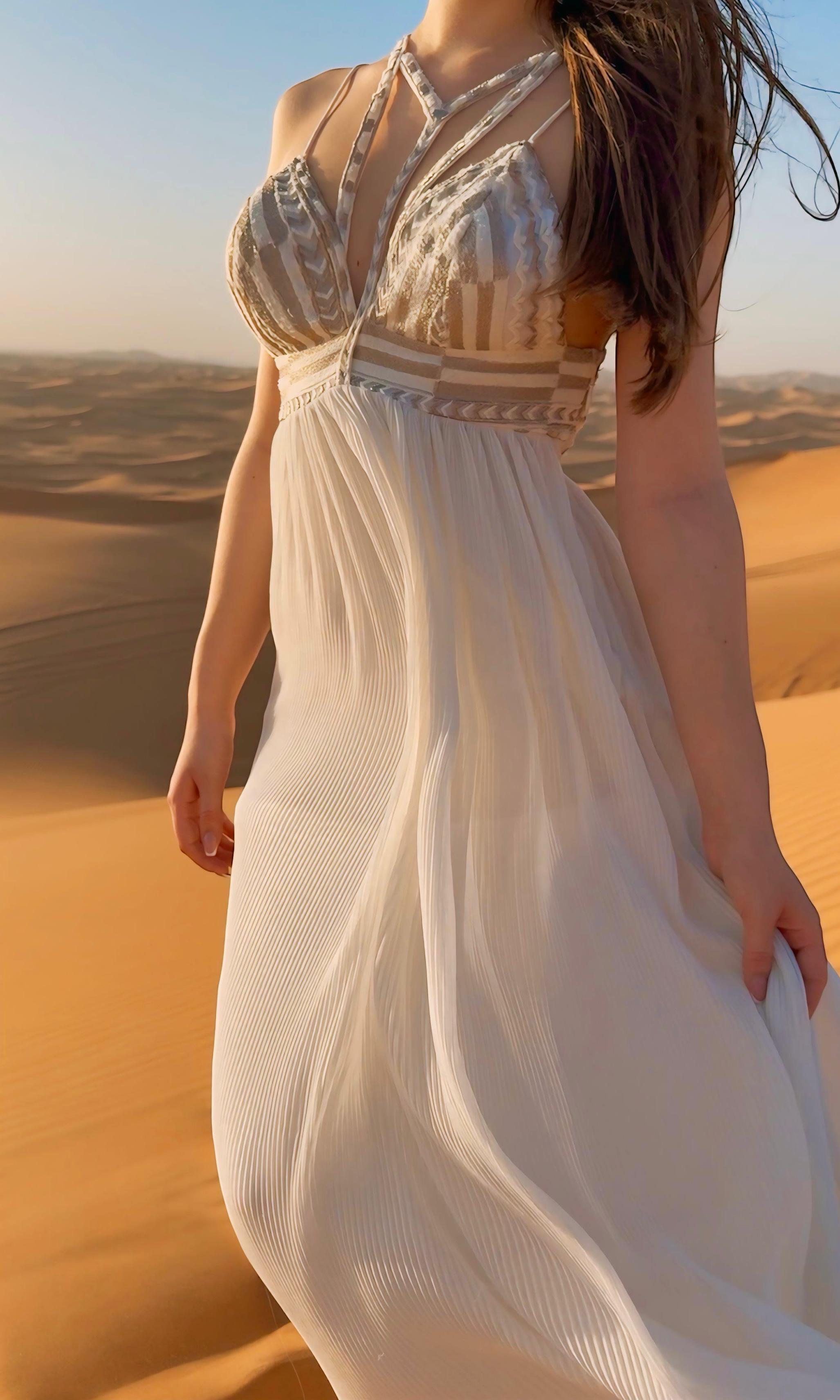 Bijela maxi haljina s dva sloja laganog materijala. Gornji dio ima tanke naramenice i trokutasti kroj s detaljima na grudima, dok je stražnji dio otvoren. Haljina se kopča skrivenim zatvaračem ispod ruke.