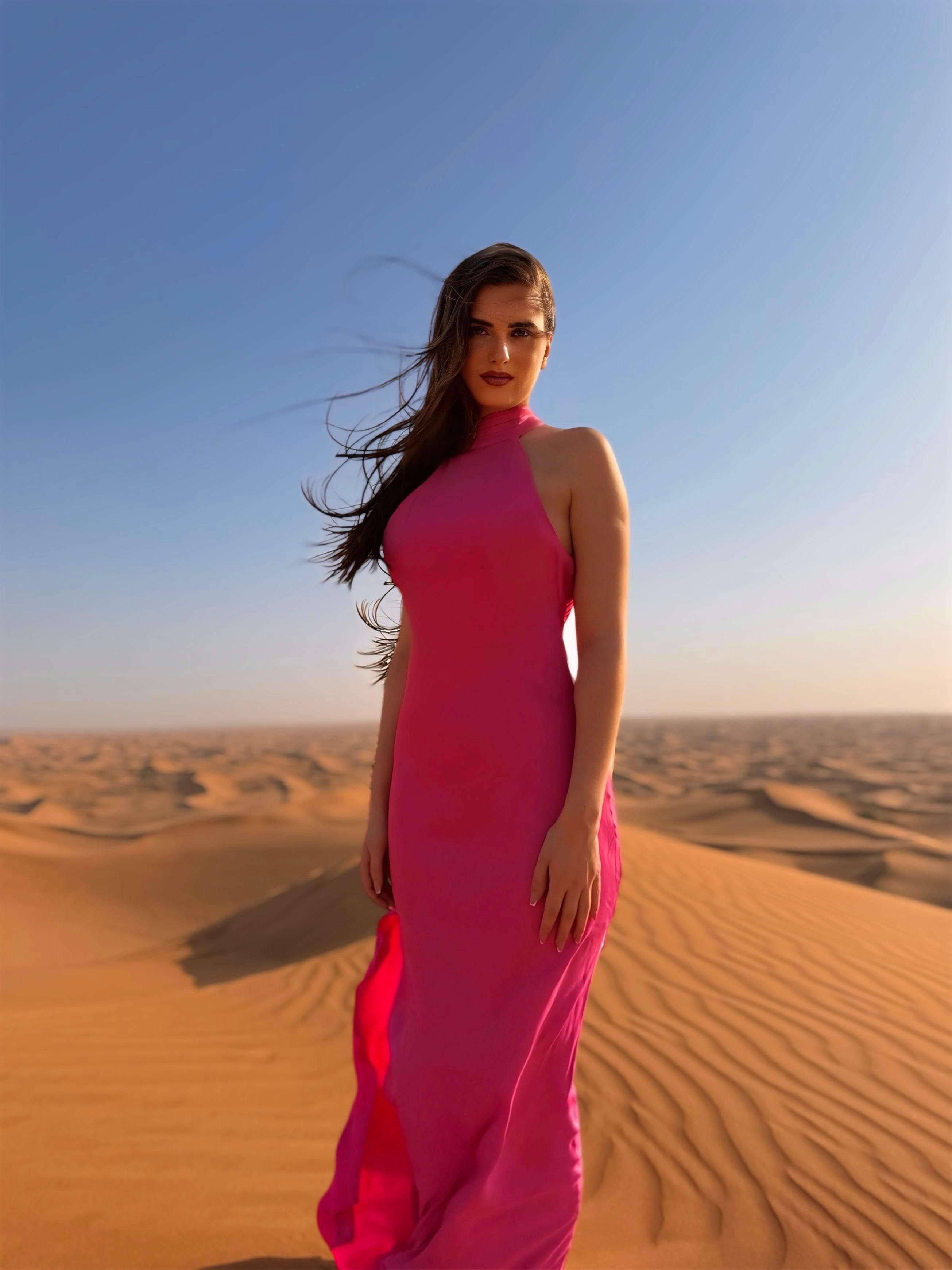 Elegantna haljina u nježnoj rozoj boji s visokim kopčanjem oko vrata na tri gumba, plisiranom kragnom i otvorenim leđima. Bočno prorezana, s decentnim gumbima u tonu haljine i skrivenim zatvaračem na stražnjem dijelu.